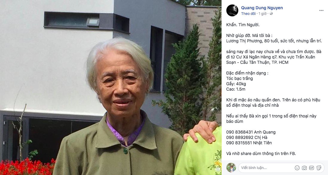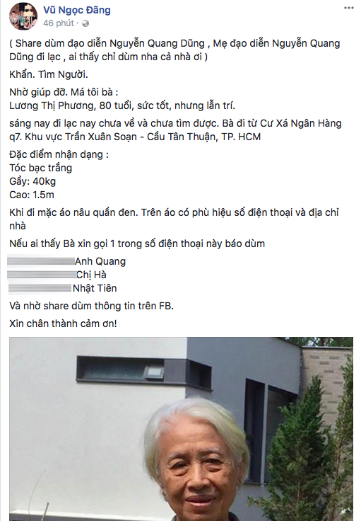 Trước đó, trên trang cá nhân, đạo diễn Nguyễn Quang Dũng đã nhờ cộng đồng mạng chia sẻ thông tin về việc mẹ ruột đi lạc. Theo đó, mẹ của đạo diễn Dũng “khùng” năm nay đã 80 tuổi, sức khoẻ tốt nhưng lẫn trí đi lạc từ sáng 25/10 đến thời điểm này vẫn chưa về nhà. Khi đi, bà mặc áo nâu quần đen và trên áo có phù hiệu in thông tin về số điện thoại cũng như địa chỉ nhà.