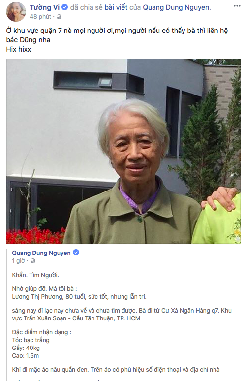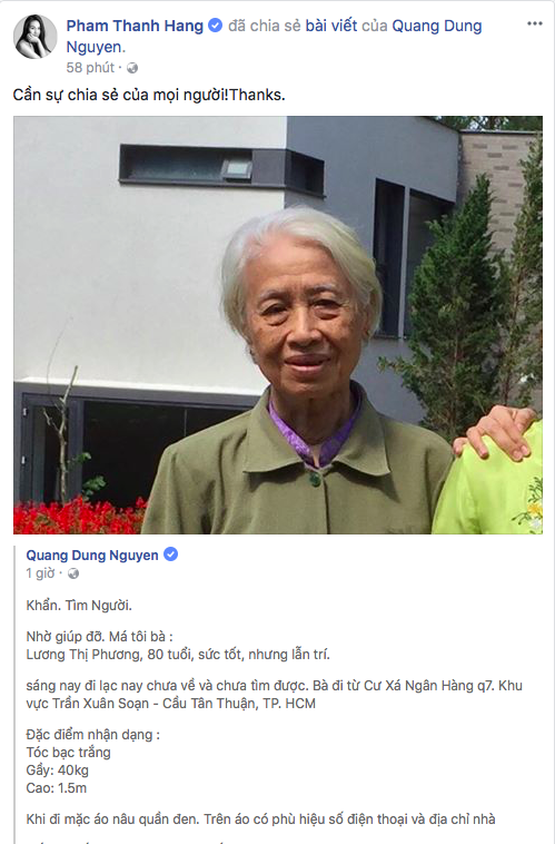 Chỉ trong thời gian ngắn, nhiều sao Việt như siêu mẫu Thanh Hằng, đạo diễn Vũ Ngọc Đãng,… và bạn bè thân thiết của nam đạo diễn Dũng “khùng” nhanh chóng chia sẻ thông tin này với hy vọng có thể sớm tìm được bà.