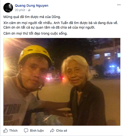 Cách đây ít phút, đạo diễn Nguyễn Quang Dũng hạnh phúc thông báo đã tìm được mẹ. Anh không quên gửi lời cảm ơn đến mọi người đã giúp đỡ chia sẻ thông tin để quá trình tìm kiếm diễn ra nhanh chóng hơn.