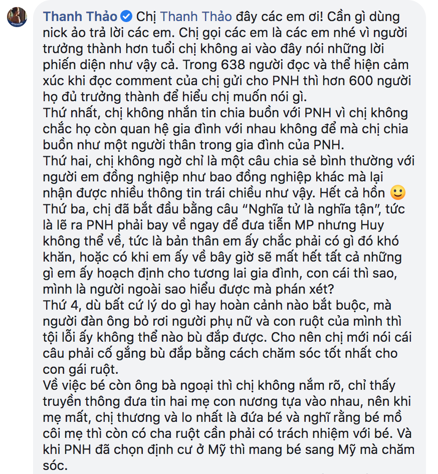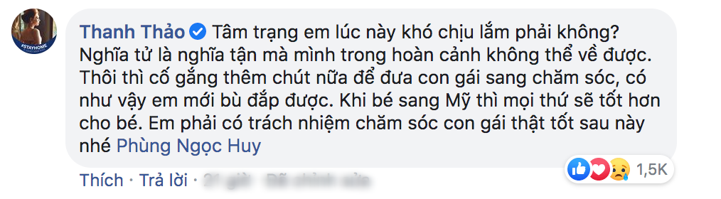 Sau khi hay tin, nữ ca sĩ Thanh Thảo cũng đã để lại bình luận an ủi anh. Cụ thể cô viết: “Tâm trạng em lúc này khó chịu lắm phải không? Nghĩa tử là nghĩa tận mà mình trong hoàn cảnh không thể về được. Thôi thì cố gắng thêm chút nữa để đưa con gái sang chăm sóc, có như vậy em mới bù đắp được. Khi bé sang Mỹ thì mọi thứ sẽ tốt hơn cho bé. Em phải có trách nhiệm chăm sóc con gái thật tốt sau này nhé Phùng Ngọc Huy“. Ngỡ đâu chỉ dừng lại ở một lời chia sẻ chân tình, không ngờ ngay sau đó lại gây ra một trận chiến “không hồi kết” bên dưới bình luận này.