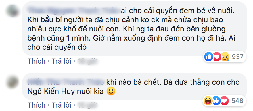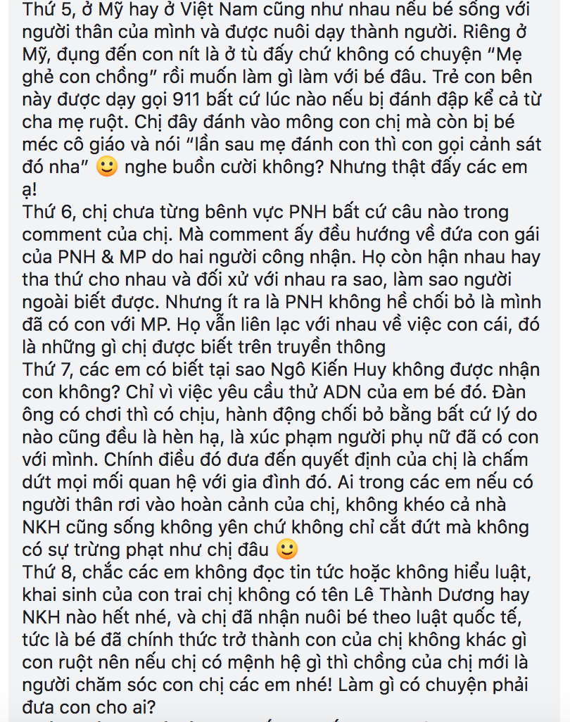 Chắc các em không đọc tin tức hoặc không hiểu luật, khai sinh của con trai chị không có tên Lê Thành Dương hay Ngô Kiến Huy nào hết nhé, và chị đã nhận nuôi bé theo luật quốc tế, tức là bé đã chính thức trở thành con của chị không khác gì con ruột nên nếu chị có mệnh hệ gì thì chồng của chị mới là người chăm sóc con chị các em nhé! Làm gì có chuyện phải đưa con cho ai?”