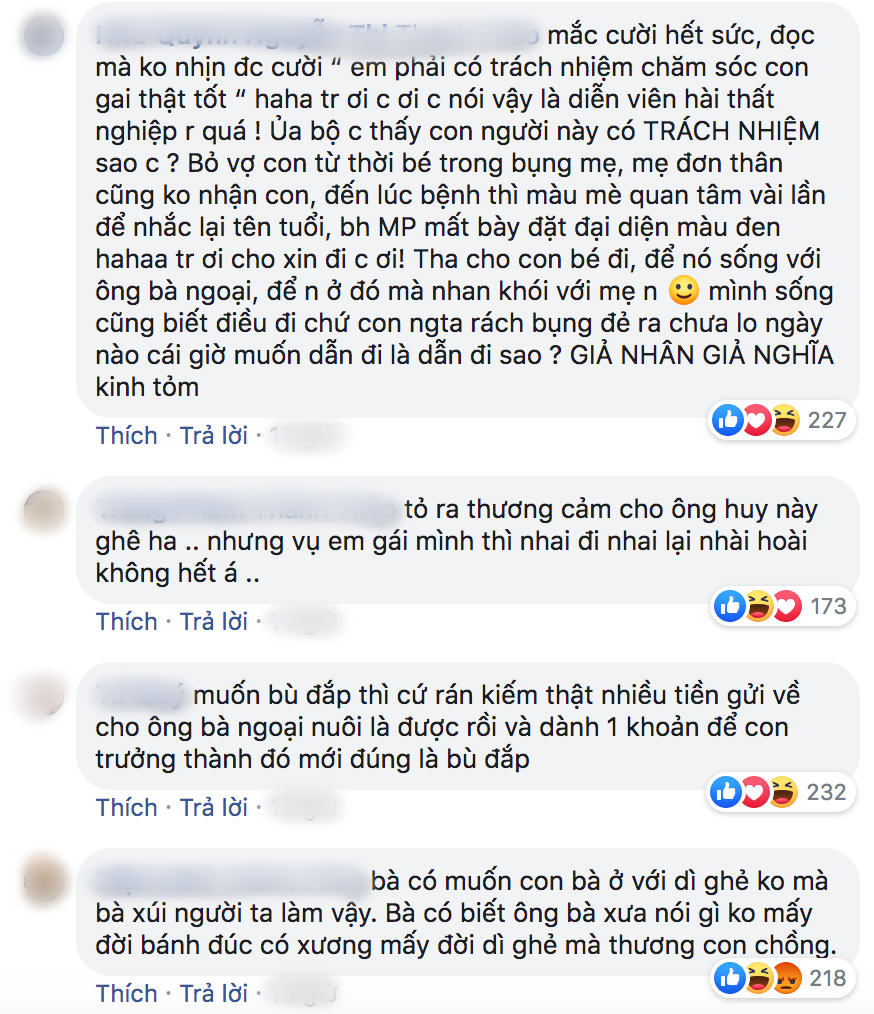 Cô phẫn nộ: “Các em cứ bảo chị nhắc đi nhắc lại chuyện cũ, trong khi chính các em lôi Ngô Kiến Huy vô so sánh với Phùng Ngọc Huy một cách kệch cỡm, vô duyên và không có tí liên quan nào. Hãy cư xử như người trưởng thành, suy nghĩ chín chắn, bình tĩnh sống chứ đừng vội luận tội hay phán xét ai nếu mình không biết hết mọi chuyện một cách thấu đáo.