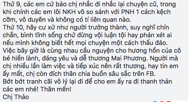 Việc bây giờ là cùng nhau cầu nguyện cho hương hồn của cô bé hiền lành, đáng yêu và dễ thương Mai Phương. Người mà chị nhiều lần làm việc và tiếp xúc nên rất thương, hay tin em ấy mất, chị còn đích thân chia buồn sâu sắc trên FB. Bớt bớt tranh cãi vô lý lại đi để cho em ấy ra đi thanh thản các em nhé! Thân mến!“.