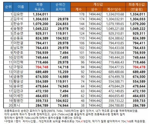 Sau khi phát sóng, nhân viên sản xuất của Produce X 101 nhận ra rằng khoảng cách giữa các phiếu bầu giống nhau. Sau khi kiểm tra lại, chúng tôi phát hiện ra rằng mặc dù không có vấn đề gì liên quan tới xếp hạng, nhưng đã có chút lỗi trong quá trình tính toán và chuyển tiếp tổng số phiếu bầu cá nhân.
