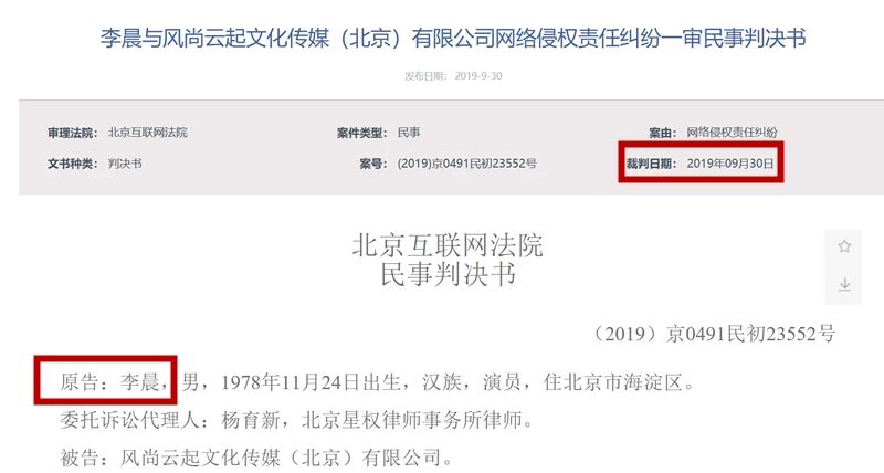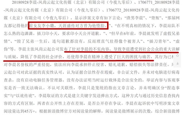 Về sau, trên mạng bắt đầu lan truyền tin đồn, tiết lộ Lý Thần phản bội Lý Tiểu Lộ và bắt ép người yêu phá thai. Tin tức này ngày càng đến tai nhiều người và gây ảnh hưởng nhất định đến cả hai. Sau cùng, Lý Thần quyết định khởi kiện. Trải qua quá trình điều tra, tòa tuyên bố Lý Thần thắng kiện, được bồi thường 50 ngàn NDT. Đối với những yêu cầu khác đến từ nam diễn viên, tòa án đã quyết định bác bỏ với lý do không đủ bằng chứng.