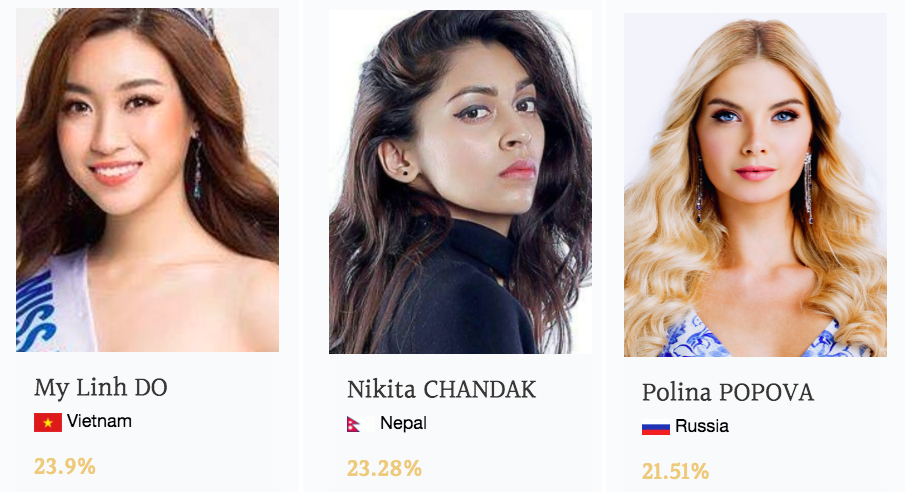Theo cập nhật mới nhất trên hệ thống bình chọn trực tuyến của Hoa hậu Thế giới 2017, Đỗ Mỹ Linh xuất sắc vươn lên dẫn đầu bảng xếp hạng với tổng số vote chiếm 23,9%. Theo sau đại diện Việt Nam là người đẹp đến từ Nepal với 23, 28% và đại diện Nga sở hữu 21,51% bình chọn.