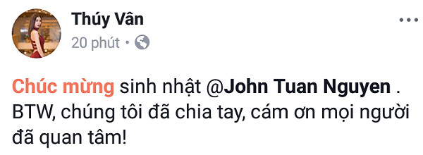 Theo đó, người đẹp sinh năm 1993 viết: “Chúc mừng sinh nhật @John Tuan Nguyen… Chúng tôi đã chia tay, cám ơn mọi người đã quan tâm”.