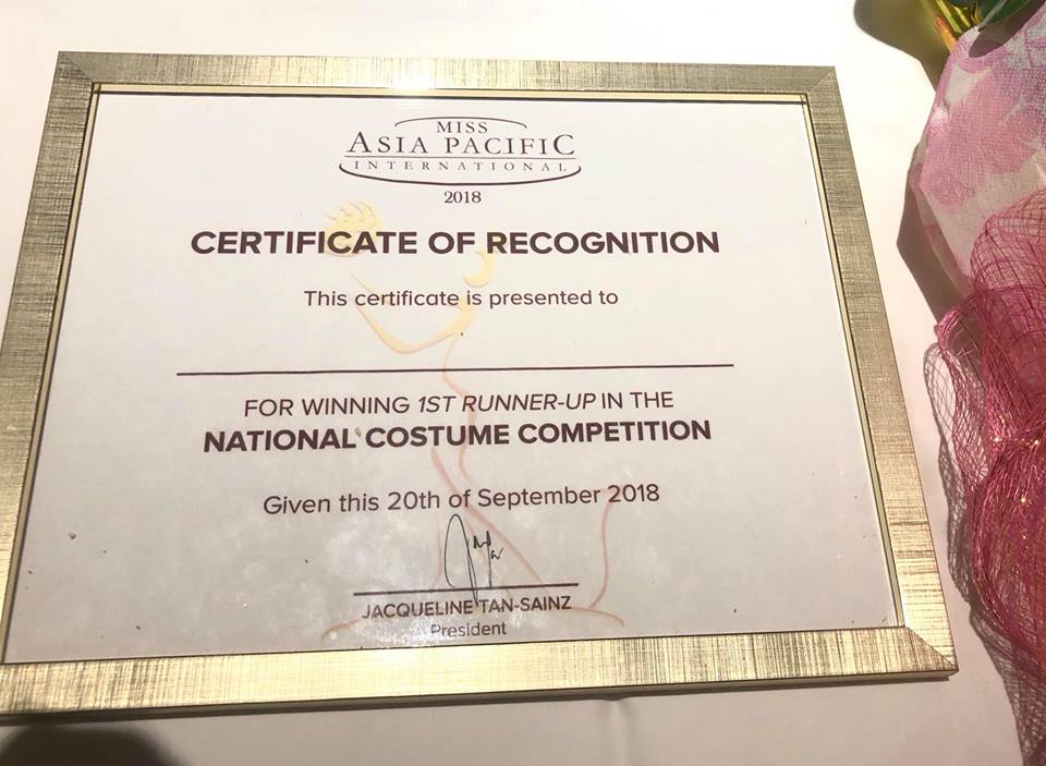 Trong quá trình tranh tài tại Miss Asia Pacific International, đại diện của Việt Nam là hoa khôi Huỳnh Thúy Vi đã xuất sắc đạt được danh hiệu Á quân 1 trong phần thi trang phục truyền thống. Diện bộ áo dài được lấy cảm hứng từ trang phục của vua chúa thời xưa thể hiện sự quyền lực cùng với khăn hình chim công được thiết kế 4D đã mang lại cho Thúy Vi giải thưởng đầu tiên tại cuộc thi năm nay.