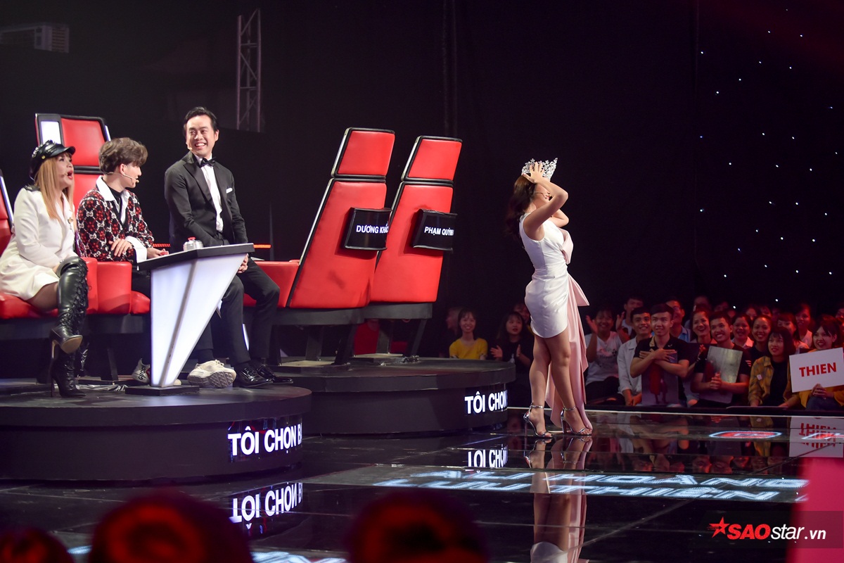 Hoa hậu Hương Giang mang vương miện đến sân khấu The Voice Kids 2019 để “dụ dỗ” các tài năng nhí.