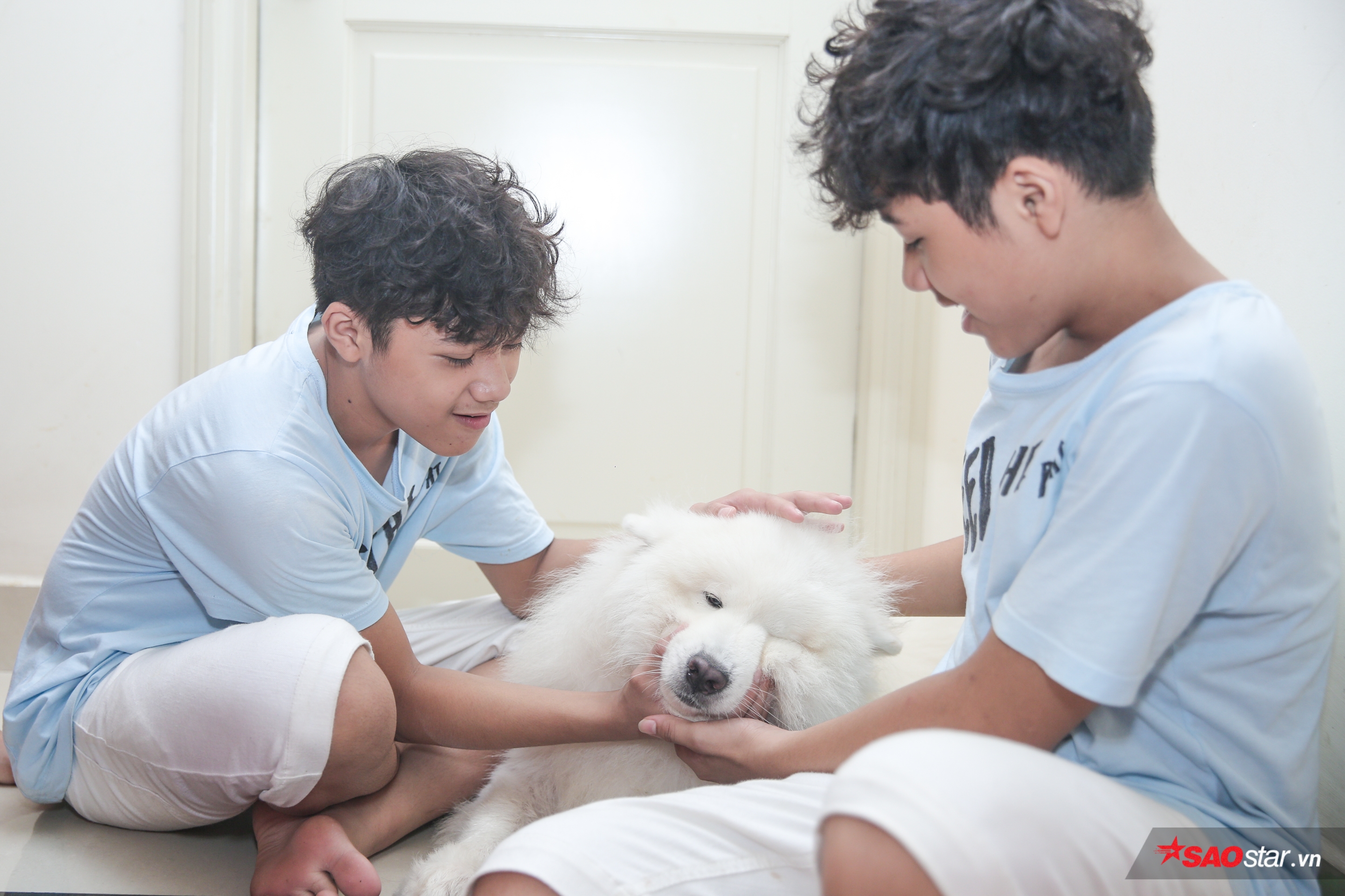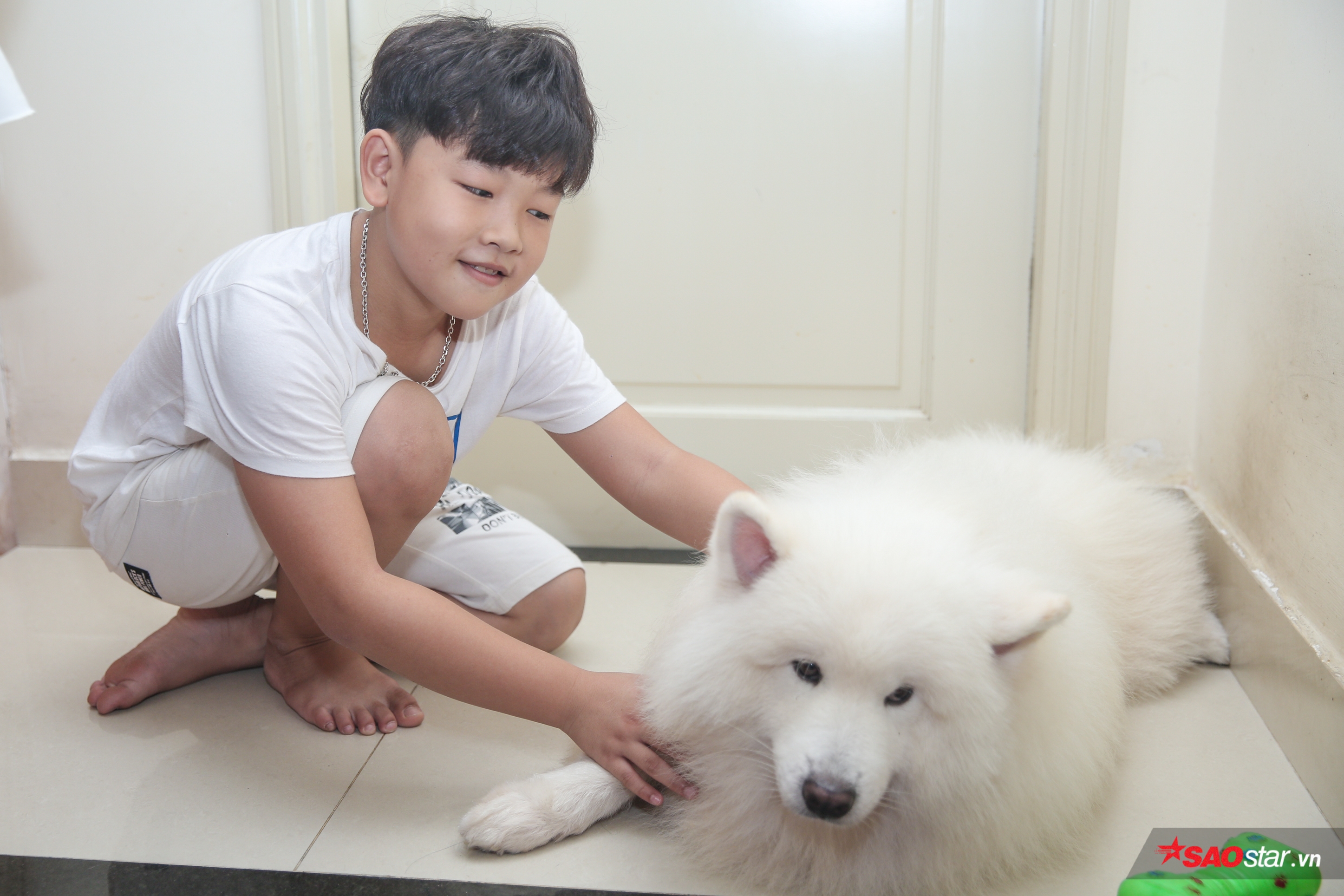 Ở nhà chung còn có một chú cún cưng trắng như bông mà bé nào cũng thích.