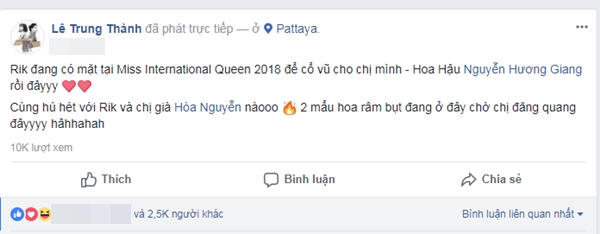 Đã có không ít sao Việt như ca sĩ Thanh Duy, hoa hậu Lam Cúc, stylist Hoàng Ku,… cùng rất nhiều bạn bè sang Thái Lan để cổ vũ cho Hương Giang. Hai đàn em thân thiết của cô nàng “tắc kè hoa” là Hòa Minzy và Erik cũng có mặt tại sân khấu để theo dõi trực tiếp đêm chung kết.