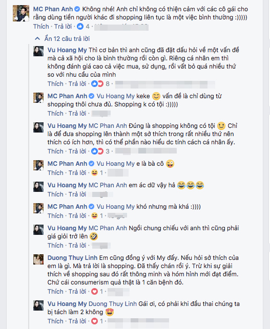 Về phía mình, MC Phan Anh cho biết thêm shopping không có tội, vấn đề là chỉ dùng từ shopping thôi chưa đủ. Nhưng Hoàng My vẫn khẳng định: “Đúng là shopping không có tội. Chỉ là để đưa shopping lên thành một sở thích trong rất nhiều thứ nên thích có ích hơn, thì có thể phần nào hiểu được tính cách cá nhân ấy“.