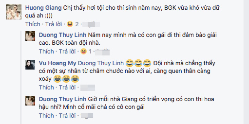 Dòng trạng thái của Hoàng My nhanh chóng thu hút nhiều sự quan tâm, bình luận của mọi người. Trong đó, hai giám khảo MC Phan Anh và Hoa hậu Hương Giang cũng đưa ra những quan điểm cá nhân rõ rệt.