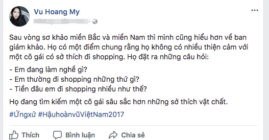 Mới đây, trên Facebook cá nhân của mình, thành viên ban giám khảo - Á hậu Hoàng My chia sẻ câu chuyện hậu trường sau khi chấm sơ khảo hai miền Bắc - Nam của Hoa hậu Hoàn vũ Việt Nam 2017.