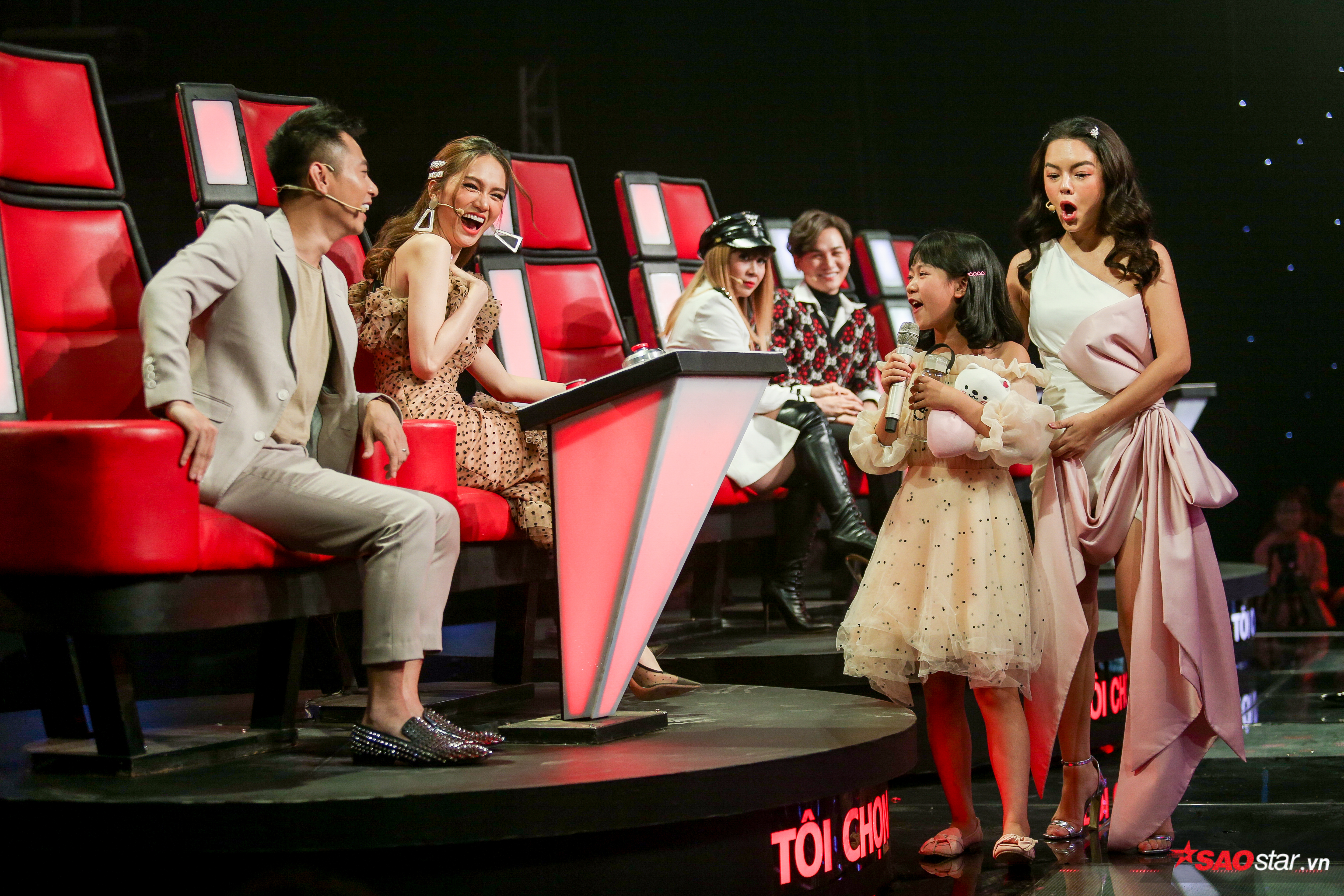 Đặc biệt là giây phút trước lúc chào tạm biệt dàn HLV để ra về, Diệp Chi không ngần ngại lại gần về phía Hương Giang và duyên dáng hỏi: “Cô còn nhớ con không? Con đi hát với cô một lần ở chùa, khi đó cô mặc một chiếc quần jean và áo da báo này. Con nghe cô làm HLV The Voice Kids năm nay, con vui cực kỳ luôn”.
