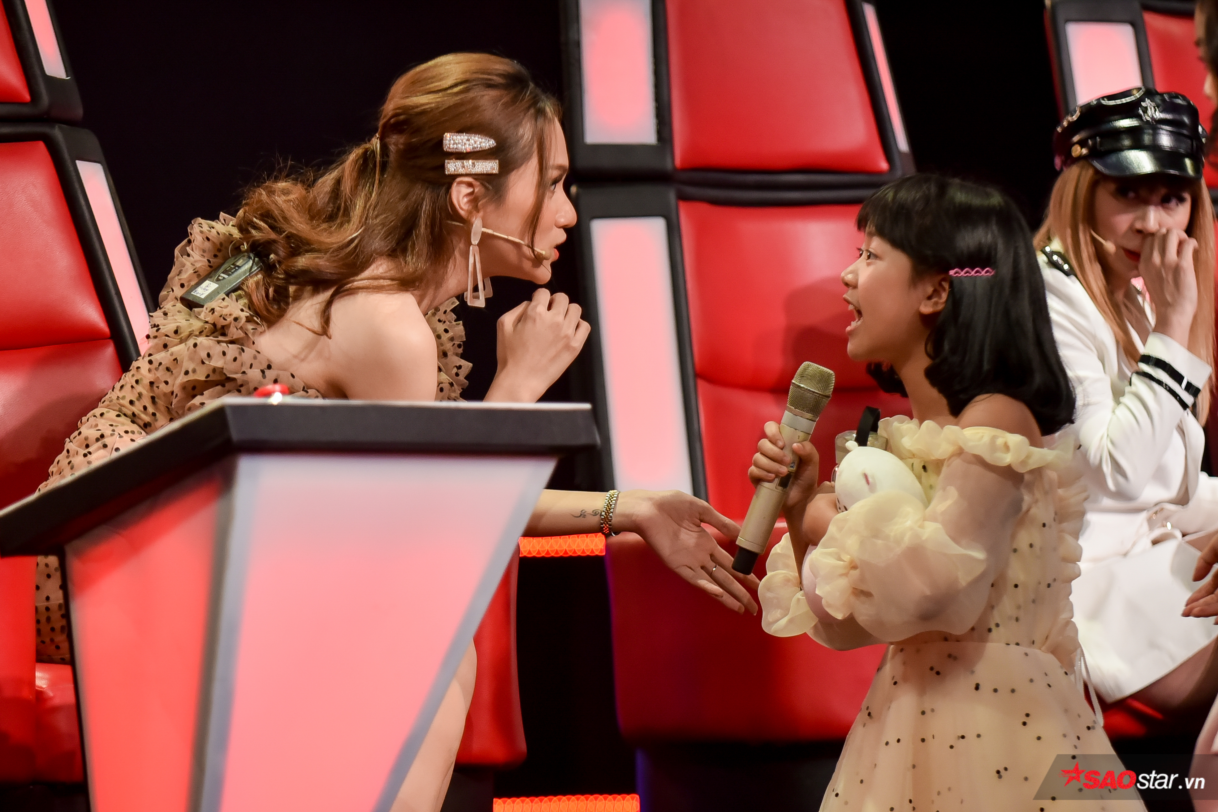 Nhìn vào mắt Hương Giang, Diệp Nhi còn nhấn mạnh: “Vòng sau con sẽ làm cho cô bất ngờ và phải hối hận vì đã không chọn con”. Nghe xong lời nói của cô bé, Hương Giang “gục ngã” trên ghế nóng do ngỡ Diệp Chi đến chào mình, hóa ra là cô bé đến “dằn mặt” nữ huấn luyện viên.