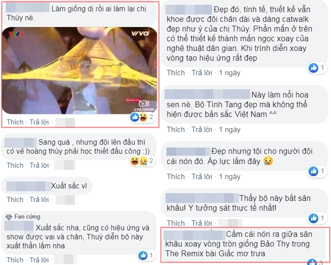 Điều thú vị là có không ít fan khuyên có cùng ý tưởng Hoàng Thùy nên chọn thiết kế “Hoa sen” vì phần nón tua rua có thể tạo điểm nhấn đặc biệt khi trình diễn giống hệt màn trình diễn múa lồng nhụy sen của nữ ca sĩ Bảo Thy tại cuộc thi Hòa âm ánh sáng - Remix New Generation 2017: “Cầm cái nón ra giữa sân khấu xoay vòng tròn giống Bảo Thy trong The Remix bài Giấc mơ trưa”, “Xuất sắc nha, cũng có hiệu ứng, khoe được vai và chân. Thuỳ diễn bộ này xuất thần lắm”…