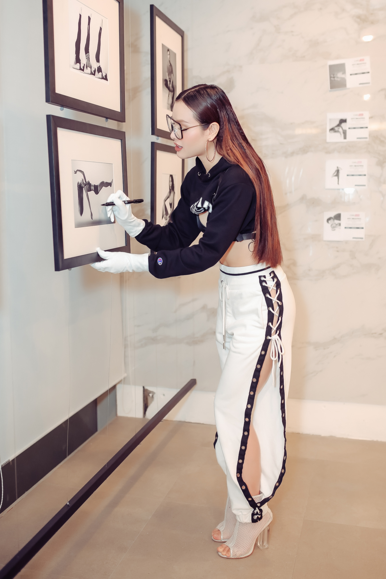 Phương Trinh Jolie đến dự triển lãm với bộ trang phục đen trắng và gây ấn tượng với những đường cắt xẻ táo bạo.