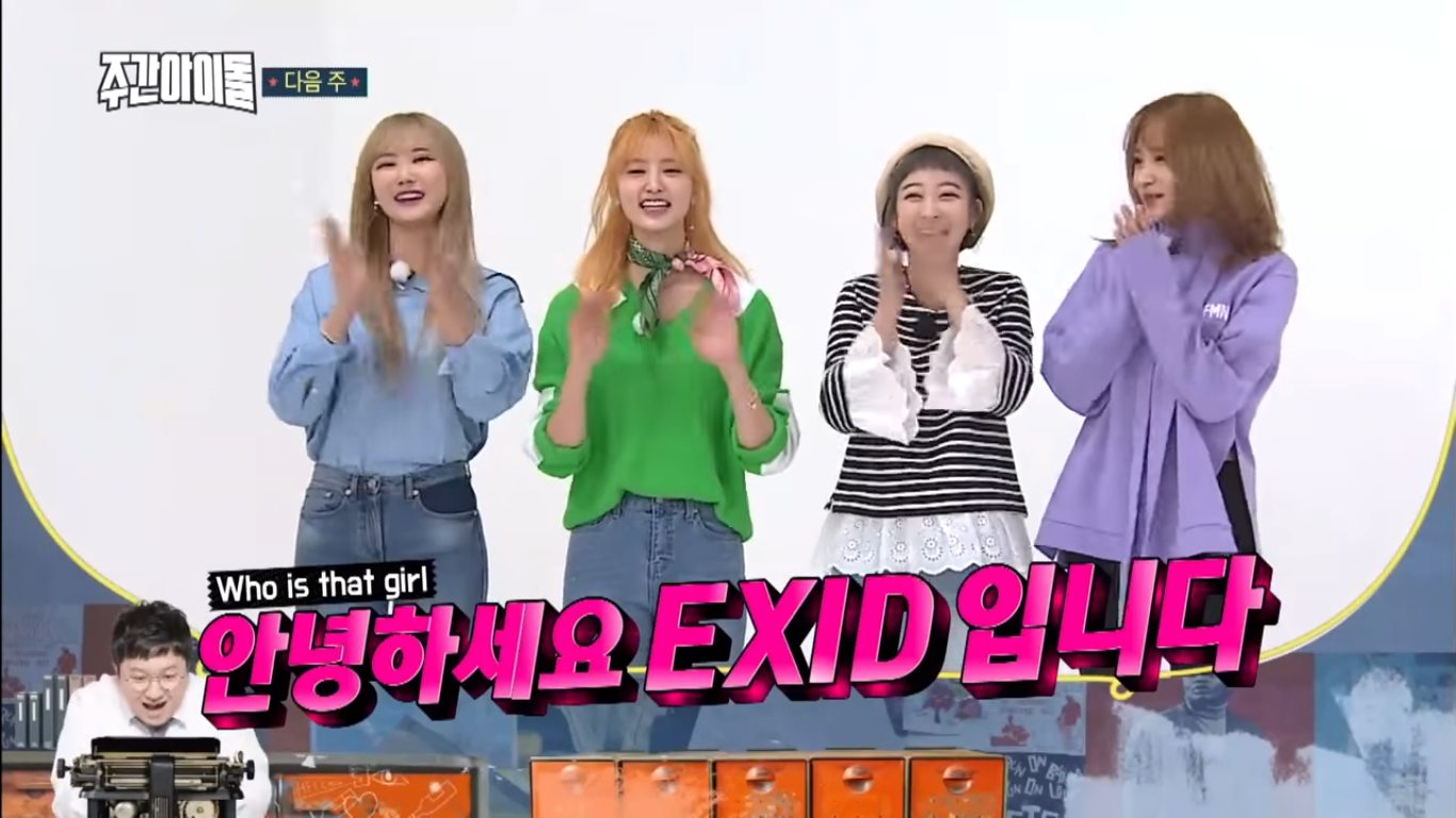 Nhóm nhạc đình đám EXID vừa có màn trở lại Weekly Idol để quảng bá cho album mới của mình, tuy nhiên, vì giọng ca chính Solji phải nghỉ bệnh nên chỉ có 4 thành viên còn lại tham gia chương trình. Sự thiếu hụt này đã vô tình khiến cho đội hình của EXID trở nên “hoảng loạn” trong thử thách Random Dance Play - một thử thách không thể bỏ lỡ khi đến với Weekly Idol. EXID đã nhảy lại một loạt các hit của mình như Up & Down, L.I.E, Ah Yeah, Hot pink… Tuy nhiên màn thử thách này của EXID diễn ra chẳng hề suôn sẻ như những lần trước nữa.