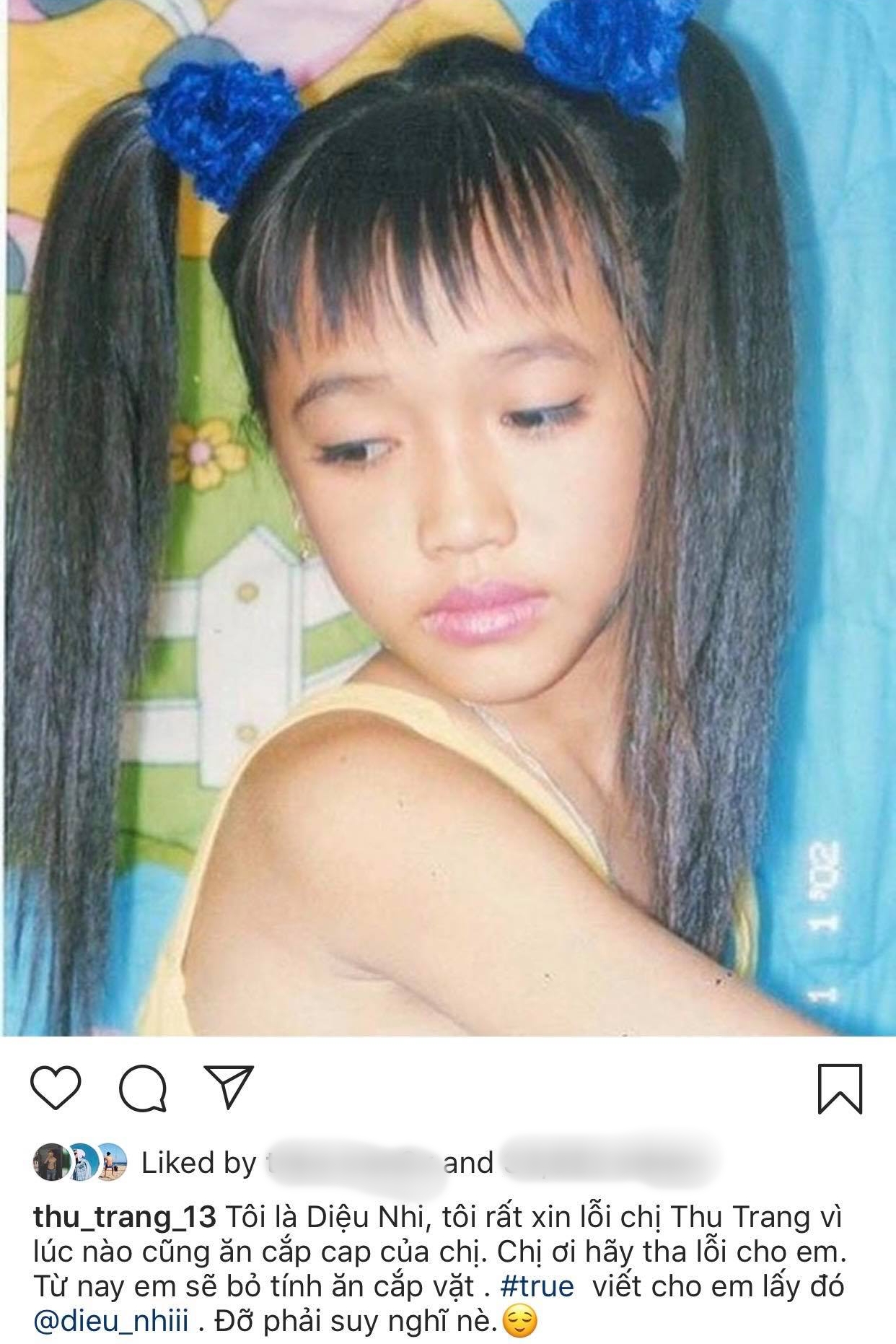 Thu Trang “khai chiến” với bức ảnh thuở bé của Diệu Nhi cùng caption ăn năn hối lỗi vì đã “ăn cắp chất xám” của “đàn chị”.