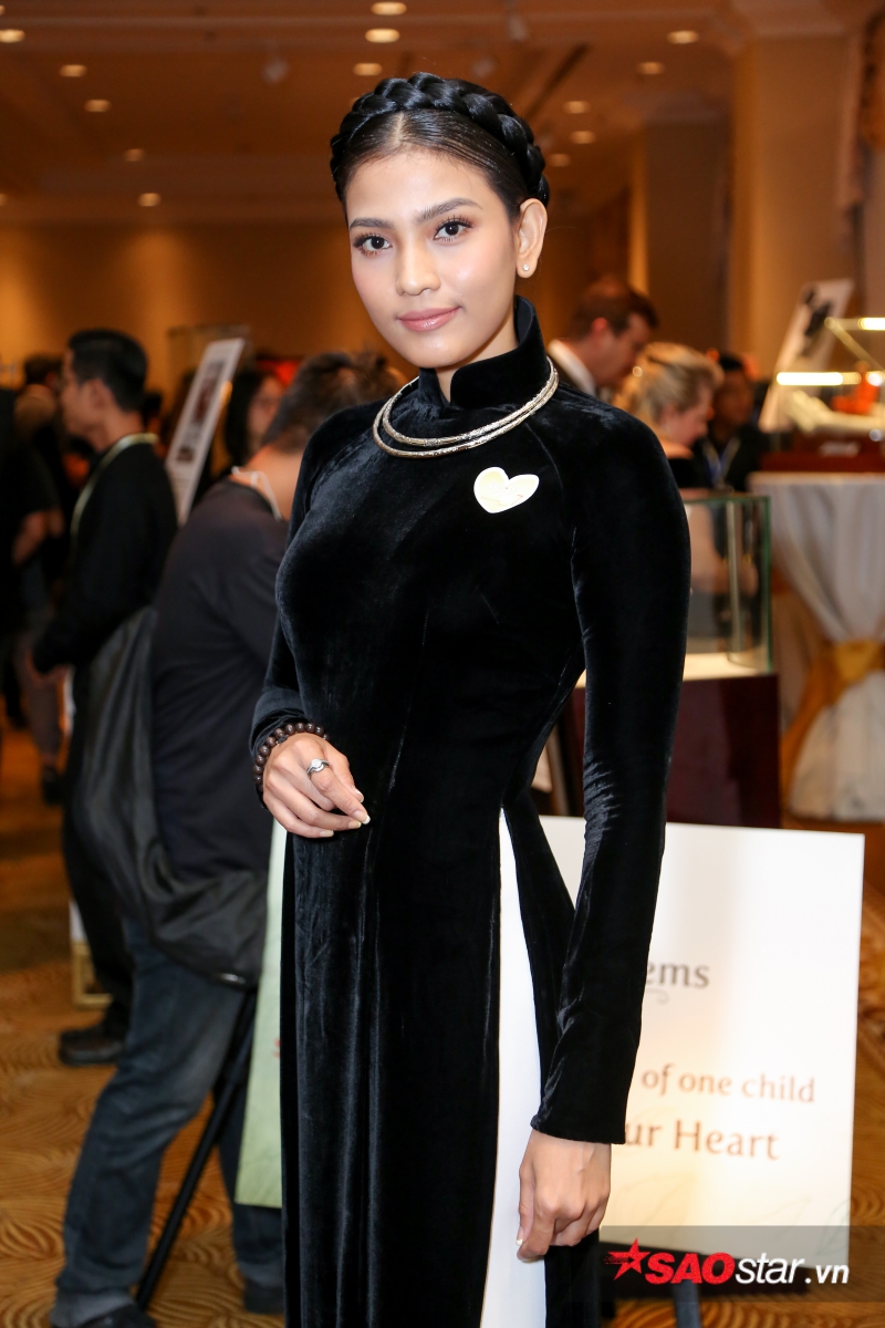 Ngô Thanh Vân diện áo dài đen nền nã. Nữ đạo diễn/diễn viên tài ba đã đặt nhiều tâm huyết cho dự án thiện nguyện này suốt 7 năm qua.