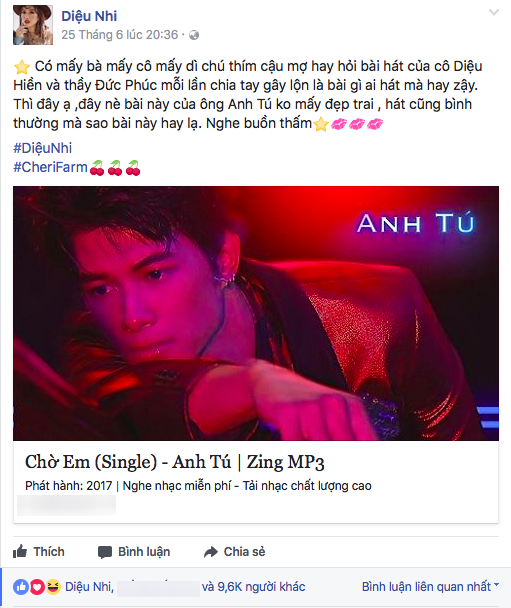 Diệu Nhi chia sẻ sản phẩm âm nhạc mới nhất của Anh Tú lên trang cá nhân cách đây vài ngày.