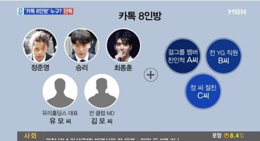 Cuối ngày, dư luận chấn động khi bản tin lúc 8h của đài MBN công bố 8 người trong phòng chat kakaotalk của Jung Joon Young bao gồm: Jung Joon Young, Seungri, Choi Jong Hoon (FTISLAND), CEO Yuri Holdings Yoo In Suk, Kim: nhân viên club, A: Người thân của một thành viên girlgroup (được cho là anh trai của Yuri SNSD), B: Nhân viên cũ của YG và C: Bạn thân của Jung Joon Young, từng xuất hiện chung trên show du lịch.