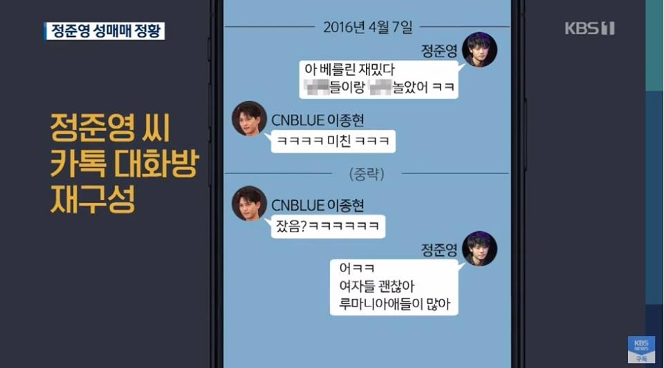 Tiếp đó, khi thấy các nhà đài lần lượt tung tin độc quyền, KBS không chịu chào thua công khai đoạn chat tố cáo Jung Joon Young chơi gái (môi giới) mại dâm. Không chỉ ở Hàn Quốc mà còn ở nước ngoài. Nghi ngờ quan hệ với cả trẻ em. Cùng thời điểm Channel A buộc tội Seungri môi giới mại dâm ở Nhật Bản và “ship hàng xuyên quốc gia”.