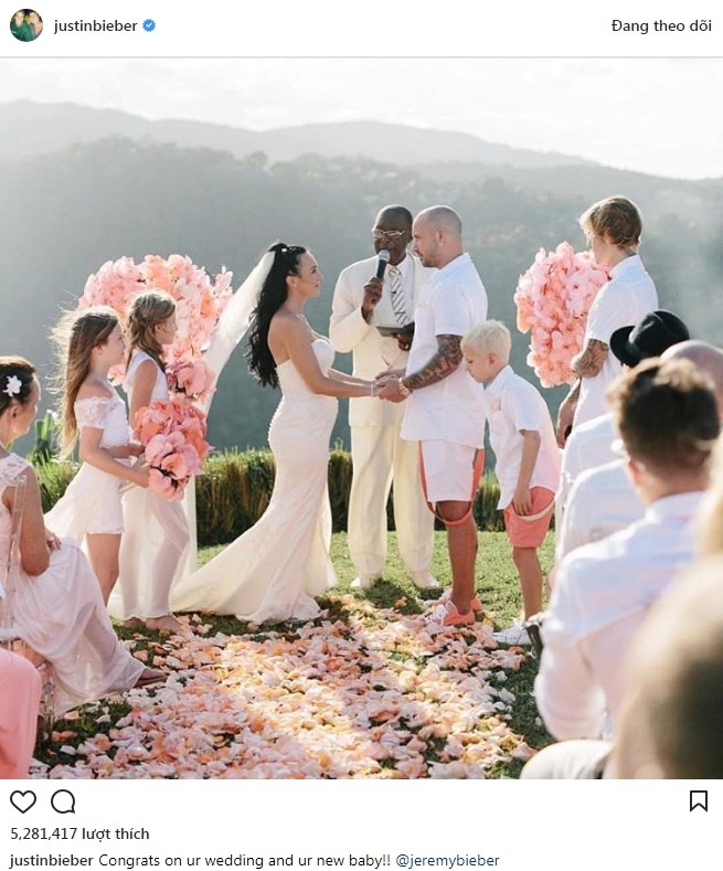 Trên Instagram, Justin cũng chia sẻ hình ảnh hạnh phúc của cặp đôi trong hôn lễ vừa qua tại Montego Bay, Jamaica kèm lời chúc mừng, xác nhận gia đình sắp có thêm thành viên mới.