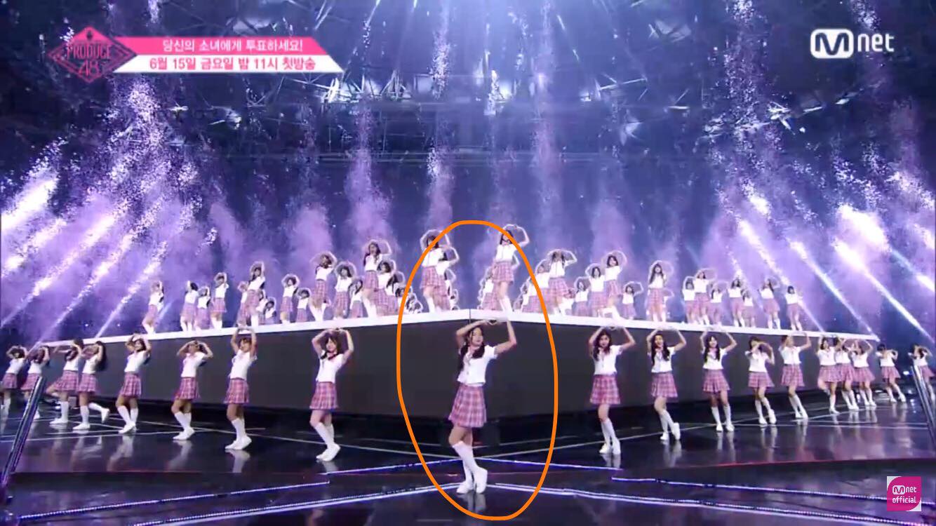 Hình ảnh Jang Gyuri đứng ở vị trí lớp F tại sân khấu ra mắt của Produce 48.