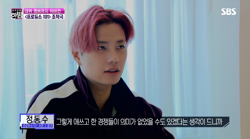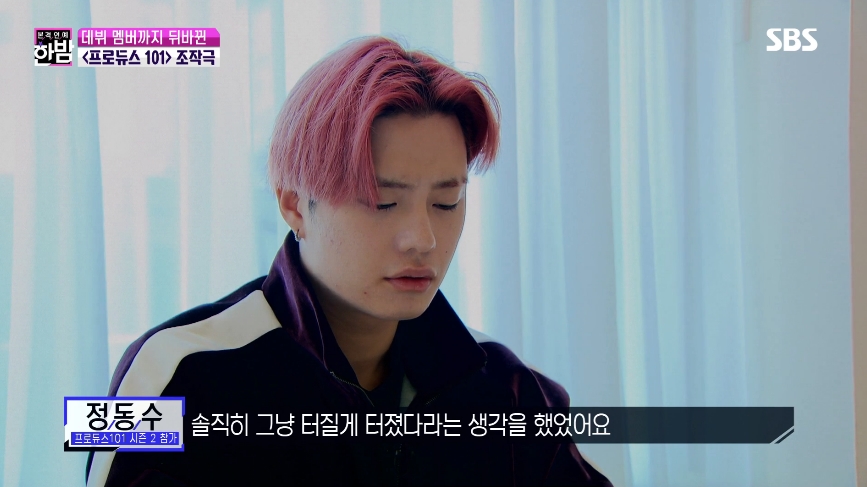 Vào tối ngày 10/12 vừa qua, chương trình Night of Real Entertainment đài SBS đã phát hành cuộc phỏng vấn trực tiếp với một số cựu thực tập sinh Produce 101 cũng như quản lý của họ về tranh cãi về thao túng phiếu bầu gần đây. Theo đó, thực tập sinh Jung Dong Soo của mùa 2 đã lên tiếng về vụ việc trên Instagram và cũng được Section TV đài MBC phỏng vấn. Qua đó, cậu đã tiết những điều khiến mình chú ý khi tham gia vào chương trình.