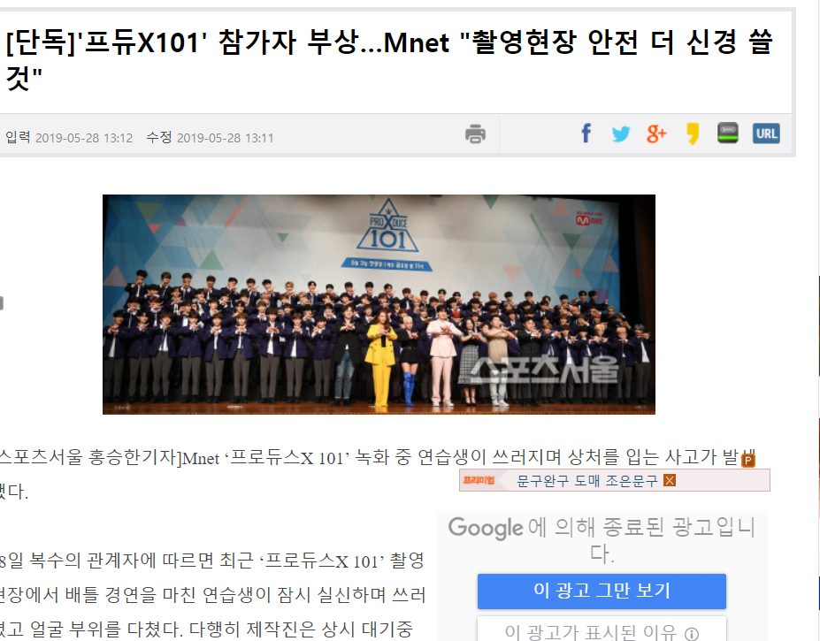 Theo báo cáo độc quyền của Sports Seoul vào ngày 28/05, thực tập sinh của chương trình truyền hình Produce X 101 đài Mnet đã bị ngất xỉu và bị thương ở mặt tại trường quay. Được biết, cậu thực tập sinh này đã nhanh chóng được nhân viên y tế chăm sóc tại chỗ và chuyển tới bệnh viện để điều trị, nhưng đã quay trở lại tiếp tục ghi hình cho vòng loại trừ đầu tiên.
