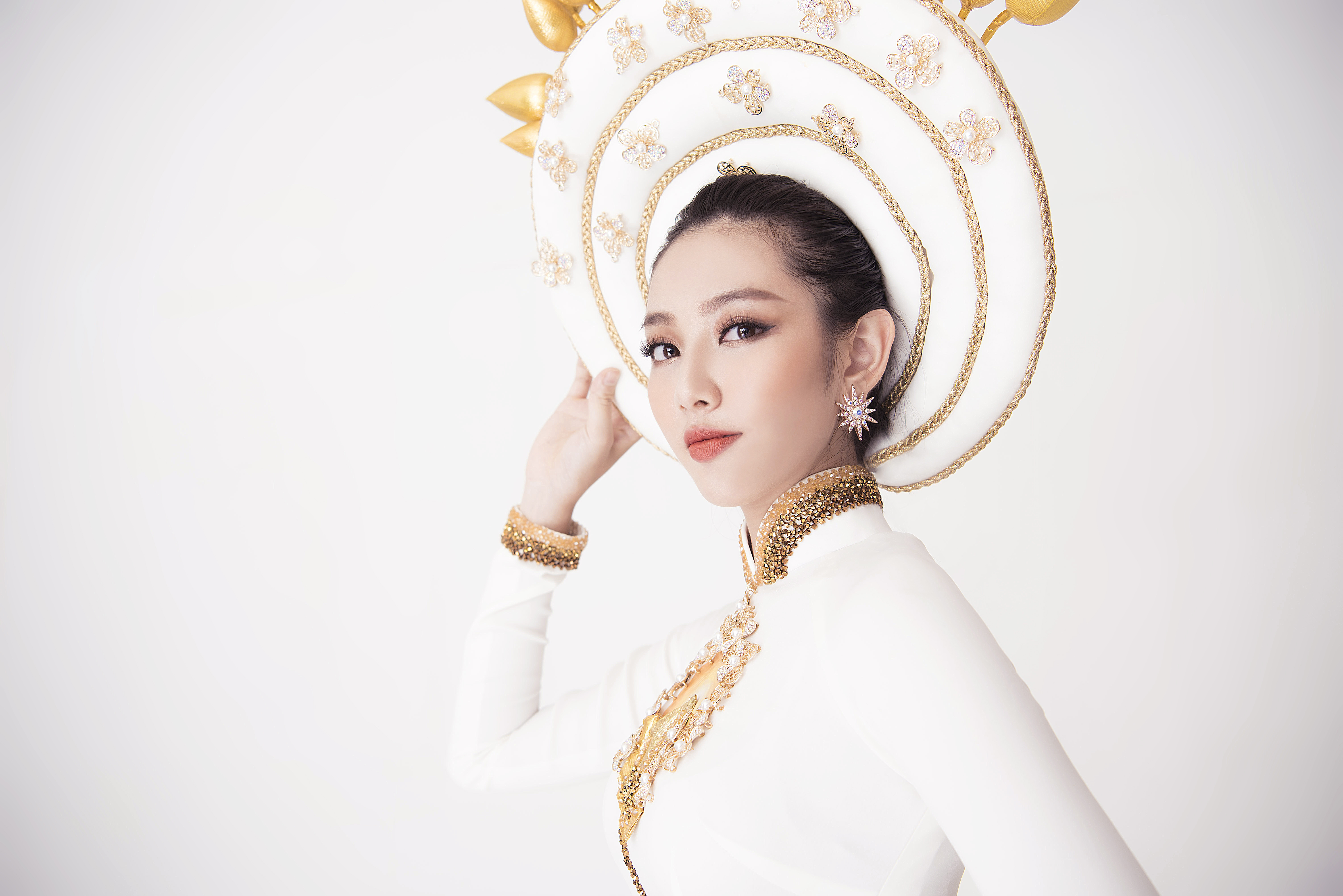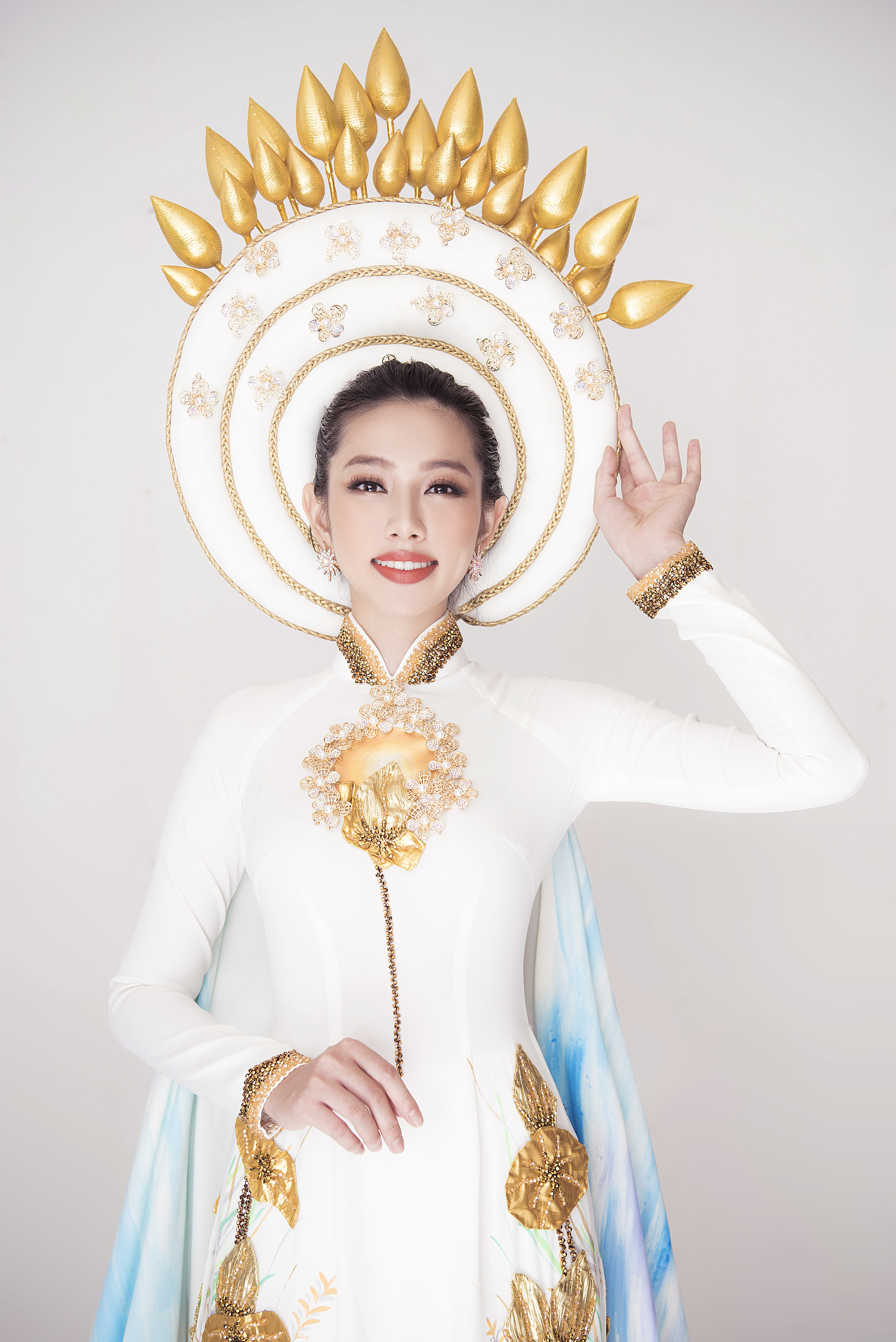 Việc lựa chọn áo dài được xem là khá quen thuộc và an toàn nhưng Thùy Tiên vẫn tự tin chọn thể hiện nét đẹp nền nã, duyên dáng qua thiết kế được nhiều bạn bè quốc tế biết đến nhất khi nghĩ về trang phục truyền thống Việt Nam. Bên cạnh đó, phần tà áo cầu kỳ với hình ảnh hoa sen rực rỡ hứa hẹn giúp Thùy Tiên dễ dàng thể hiện trang phục và thật sự bắt sáng, cuốn hút trên sân khấu.