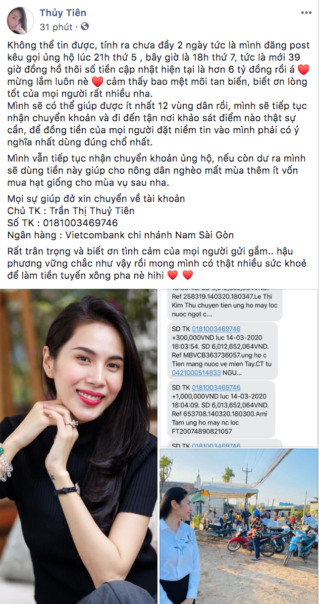Chia sẻ trên trang cá nhân, Thuỷ Tiên viết: “Không thể tin được, tính ra chưa đầy 2 ngày (mình đăng bài kêu gọi ủng hộ lúc 21h thứ 5, bây giờ là 18h thứ 7, tức là mới 39 giờ đồng hồ thôi) số tiền cập nhật hiện tại là hơn 6 tỷ đồng rồi á. Mừng lắm luôn nè, cảm thấy bao mệt mõi tan biến, biết ơn lòng tốt của mọi người rất nhiều nha.
