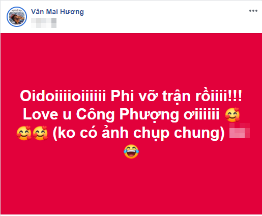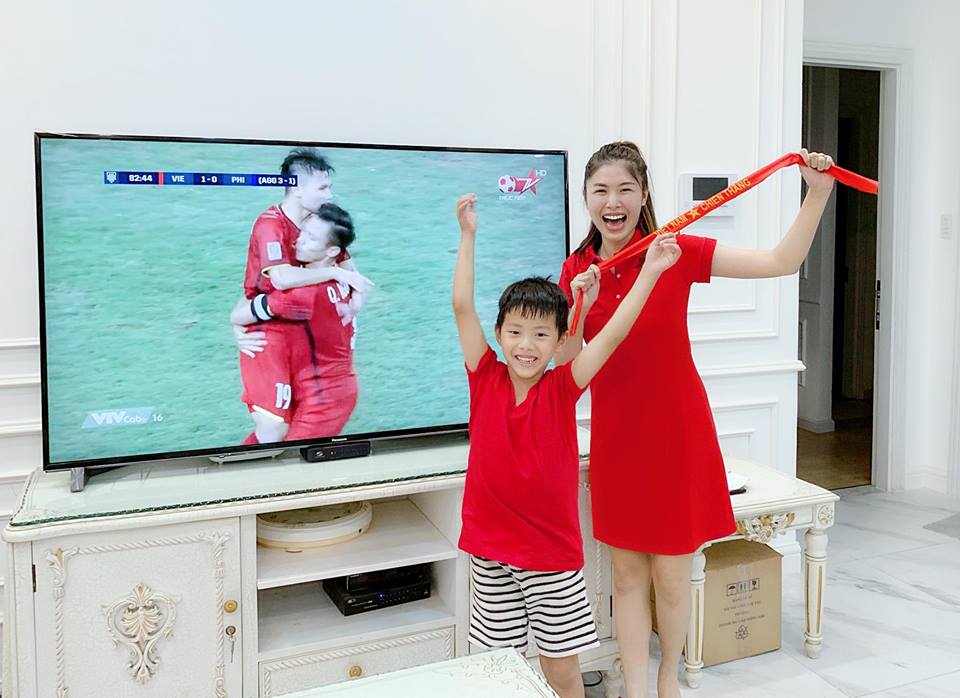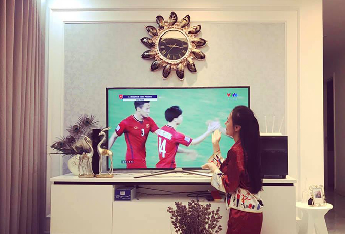 Phương Oanh chia sẻ niềm vui dành cho đội tuyển Việt Nam “Lần đầu tiên trong đời xem một trận bóng đá đúng nghĩa, còn cố tình mặc bộ màu đỏ để cổ vũ cho đội tuyển nước nhà. Oh Yeah! Các em chạy trên sân còn chị chạy tại chỗ để thả tim cho các em mà cũng toát cả mồ hôi hột đây này. Lần đầu bị mê trai trẻ”.