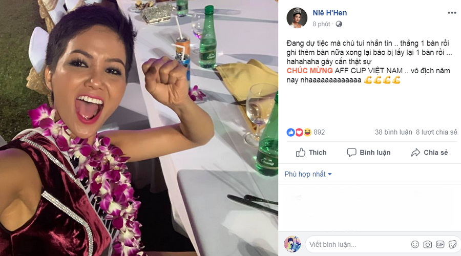 MC Nguyên Khang chia sẻ cảm xúc của mình khi Đội tuyển Việt Nam vào chung kết: “Thiệt là đã quá đã quá.. Dòng người đổ ra quận 1 ăn mừng chiến thắng của đội tuyển Việt Nam. Em cũng “đi bão”, kèn trống tưng bừng… Việt Nam hôm nay đá hay quá, thể lực dẻo dai, kỹ thuật điêu luyện, tinh thần phấn chấn. Yêu quá Việt Nam ơi!”.