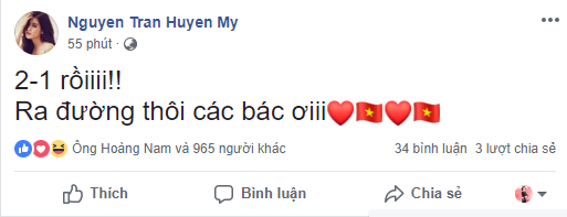Đăng Khôi chia sẻ niềm vui chiến thắng cùng với đội tuyển Việt Nam. Bà xã của nam ca sĩ không khỏi vui mừng “Đi bão thôi. lời nguyền trên sân Mỹ Đình đã được giải rồi!”