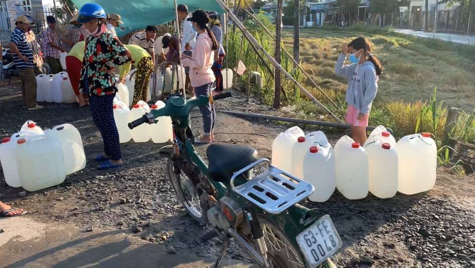“Tiên vừa đi khảo sát đặt máy lọc nước điểm đầu tiên ở xã Tân Phước, huyện Gò Công Đông, tỉnh tiền giang. Có 16.000 dân và đang thiếu nước, nước thùng can các bạn thấy là nước chỉ dùng để tắm giặt tiết kiệm thôi, chứ không thể uống và nấu ăn được vì độ mặn còn 1.600 lận.