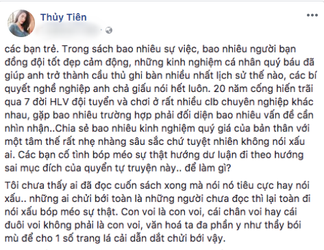 Trước những ồn ào này, mới đây, Thuỷ Tiên đã lên tiếng bảo vệ ông xã. Cô khẳng định Công Vinh viết tự truyện để chia sẻ kinh nghiệm quý giá của bản thân với tâm thế nhẹ nhàng, sâu sắc chứ tuyệt nhiên không nói xấu ai.