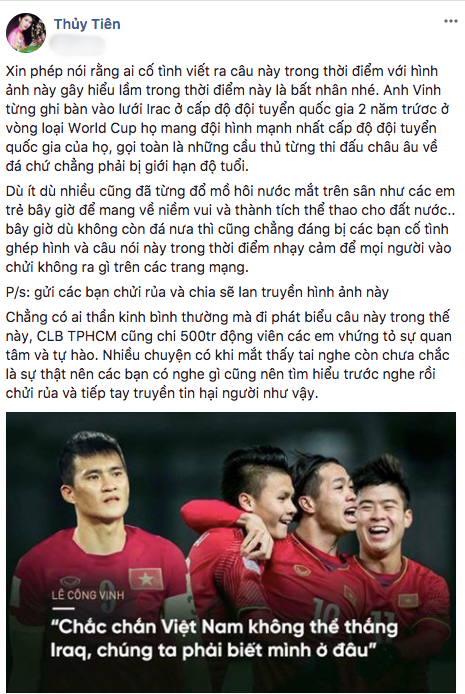 Đây không phải là lần đầu tiên Thuỷ Tiên công khai lên tiếng bênh vực ông xã. Trước đó, thời điểm Công Vinh bị đặt điều “trù dập” đàn em U23 Việt Nam, cô cũng chia sẻ bài viết đính chính sự thật để tránh sự việc bị đẩy di quá xa.
