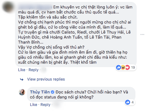 Ngay sau khi đăng tải, bài viết lập tức nhận được đông đảo sự quan tâm từ cộng đồng mạng. Phía dưới phần bình luận vẫn tiếp tục xuất hiện những bình luận chia làm hai chiều dư luận. Dù vậy, trước các ý kiến tiêu cực, Thuỷ Tiên vẫn giữ thái độ bình tĩnh và nhẹ nhàng đáp trả.