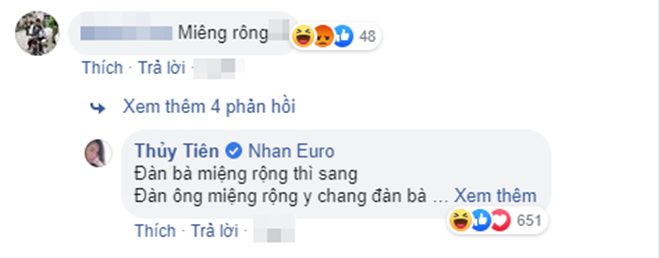 Bên dưới bức ảnh, nhiều lời khen dành cho nhan sắc trẻ trung của bà xã Công Vinh. Thế nhưng có 1 khán giả đã buông lời chê bai dành cho Thủy Tiên với từ ngữ khá khiếm nhã và cho rằng miệng của cô rất rộng. Ngay lập tức Thủy Tiên đã đáp trả lại bình luận này rằng “Đàn bà miệng rộng thì sang. Đàn ông miệng rộng i chang đàn bà”.