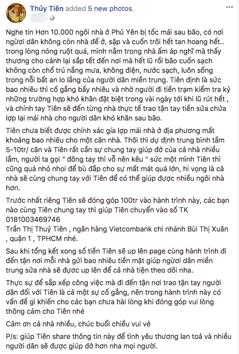 Cụ thể, trên trang cá nhân, Thuỷ Tiên viết: “Nghe tin hơn 10.000 ngôi nhà ở Phú Yên bị tốc mái sau bão, có nơi người dân không còn nhà để ở, sập và cuốn trôi hết tan hoang hết, trong lòng nóng ruột quá, mình nằm trong nhà ấm áp nghĩ mà thấy thương cho cảnh lại sắp Tết đến nơi mà hết lũ rồi bão cuốn sạch không còn chổ trú nắng mưa, không điện, nước sạch, luôn sống trong nỗi bất an lo lắng của người dân miền Trung.