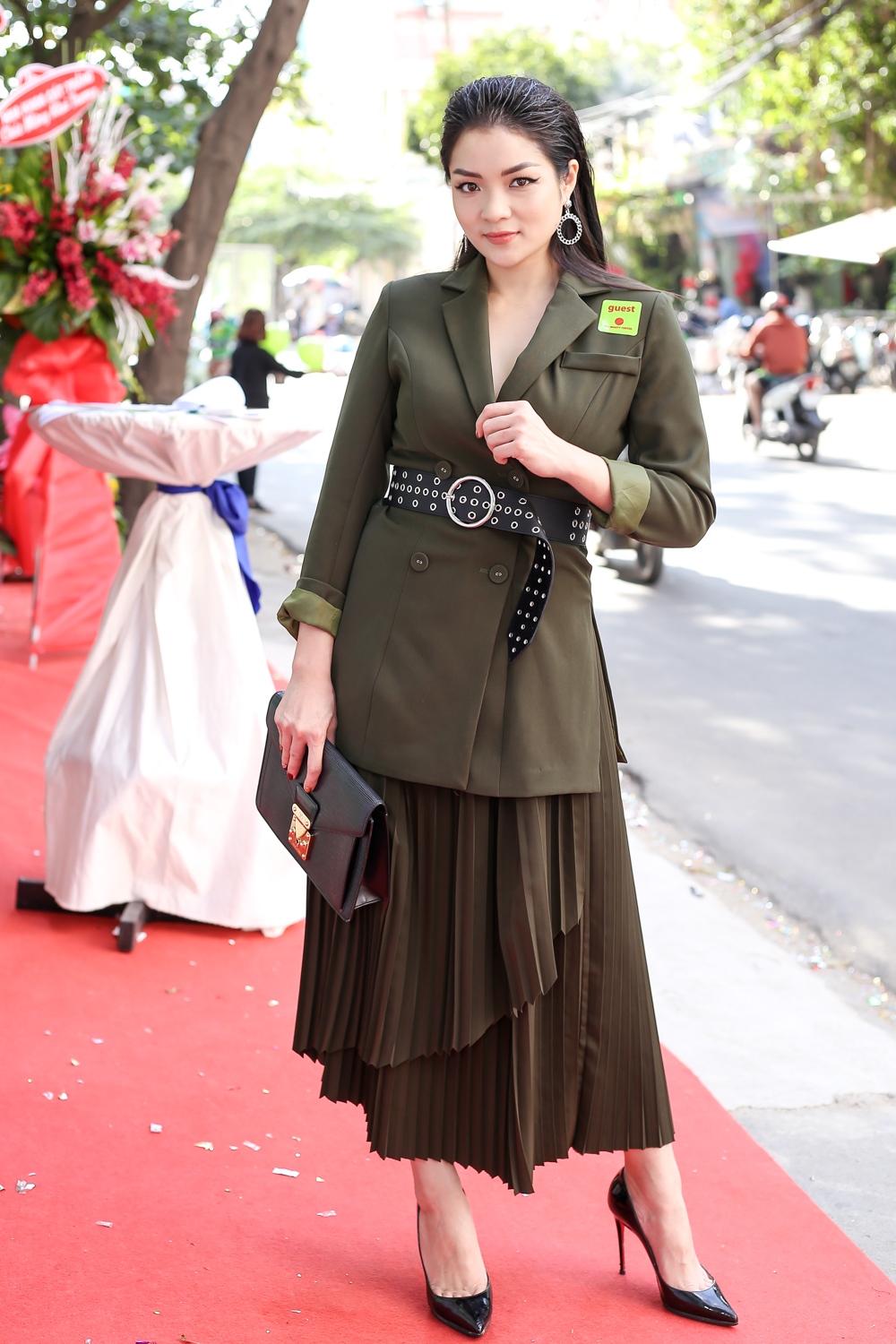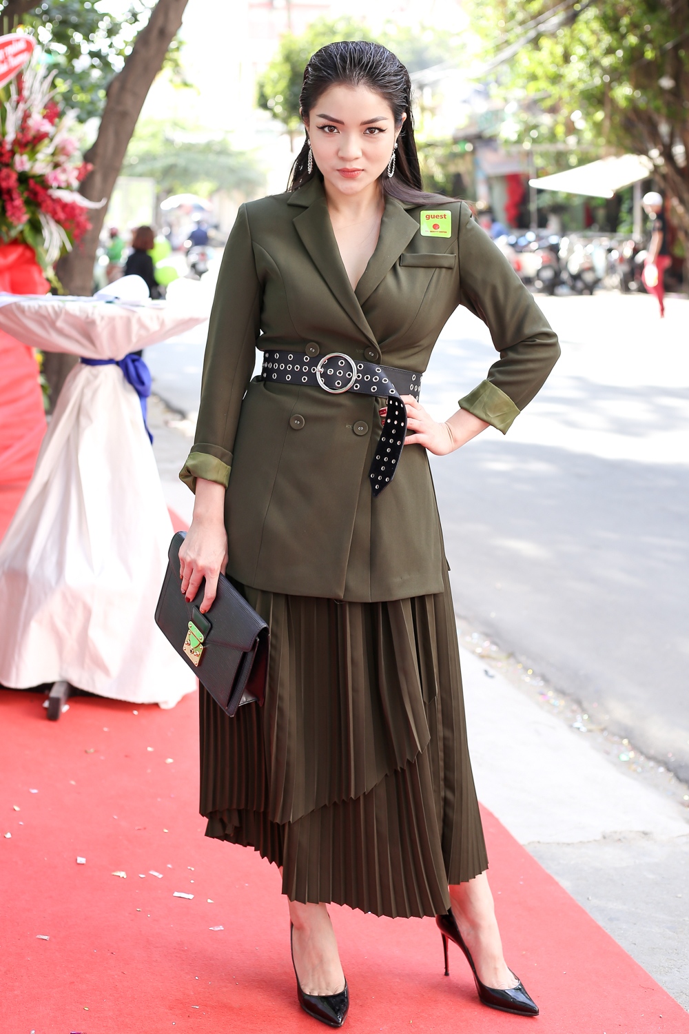 Cô diện áo blazer bên ngoài chân váy dài xếp tầng cùng gam màu xanh quân đội.