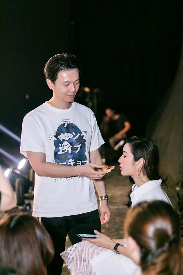 Á hậu chia sẻ “Mới tuyển được trợ lý chăm sóc nhiệt tình lúc đi quay lắm cả nhà ạ”. Thuý Vân diện 1 bộ váy rộng khéo léo che vòng 2 của mình. Trong khi ông xã của Á hậu đứng cạnh diện 1 bộ quần áo ở nhà thoải mái, cầm đồ ăn tận tình bón cho người đẹp.