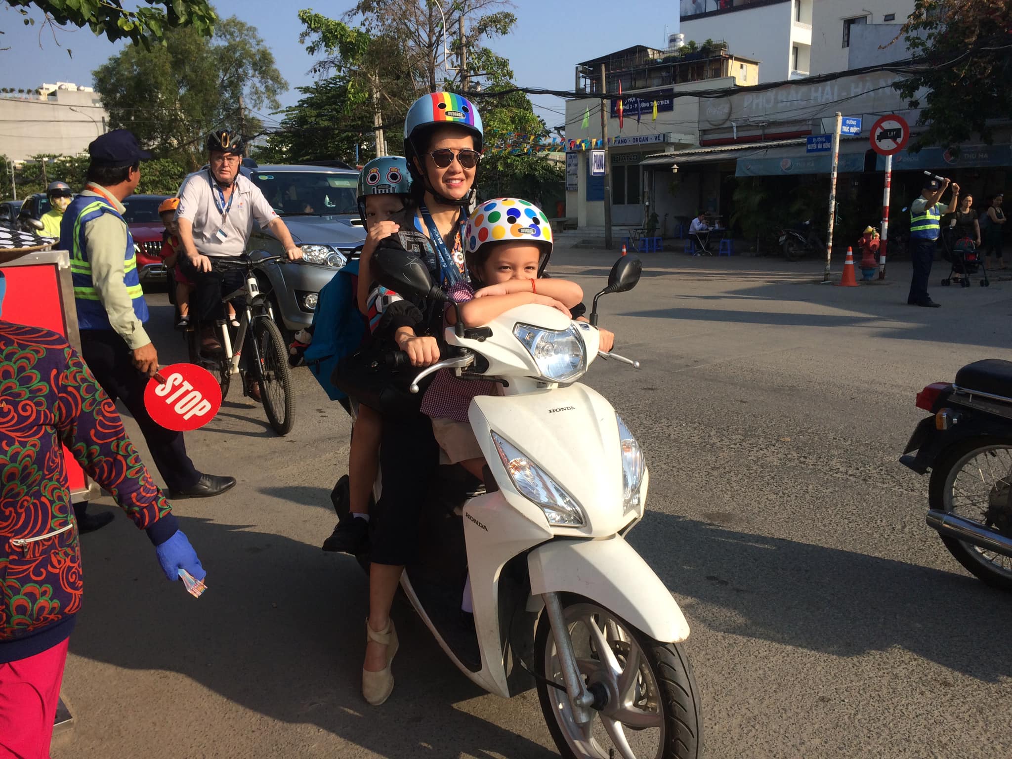 ba mẹ con vi vu trên chiếc xe tay ga quen thuộc vừa đi vừa hát líu lo
