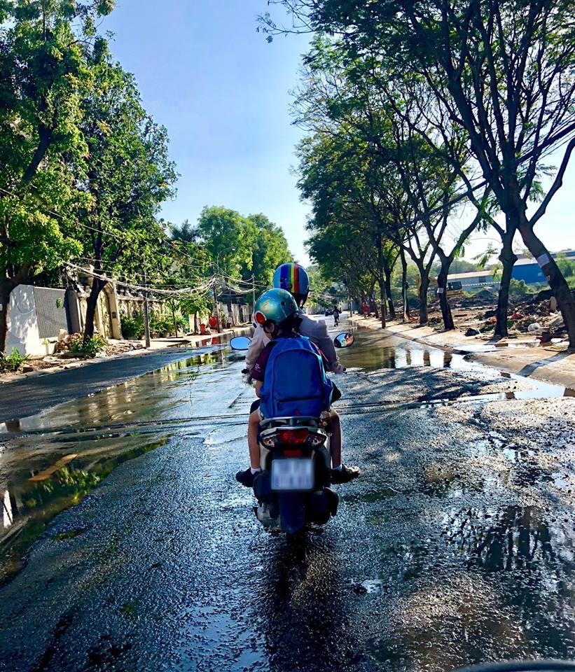 Đi kèm đó là hình ảnh 3 mẹ con trên chiếc xe máy trắng trên đường đi học. Tôm và Tép có vẻ vô cùng thích thú khi được mẹ đưa đón đi học trên chiếc xe máy. Khuôn mặt 2 nhóc tì nhà Hồng Nhung vô cùng hạnh phúc.