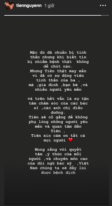 “Mặc dù đã chuẩn bị tinh thần nhưng khi biết tin nhiễm bệnh thật không dễ chút nào. Tiên thật may mắn vì có sự động viên tinh thần của ba má, gia đình, bạn bè và những người yêu mến. Trên hết là sự tận tâm chăm sóc của các bác sĩ, anh chị điều dưỡng. Tiên sẽ không phụ lòng yêu mến và quan tâm của mọi người. Mong rằng với quyết tâm, ý thức của mỗi người, chuyên môn của các bác sĩ, Việt Nam sẽ đẩy lùi được bệnh dịch” - Em chồng Tăng Thanh Hà viết.