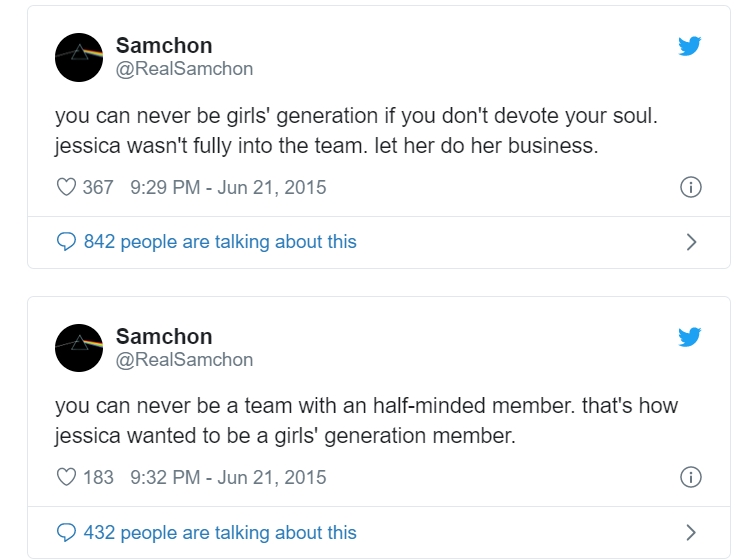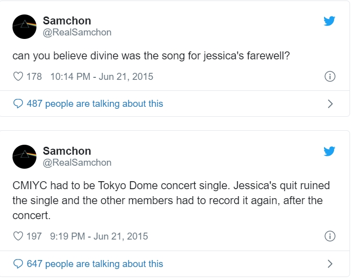 Tuy nhiên, có nhiều nguồn tin nội bộ chia sẻ về quyết định của Jessica. Trong đó, ngày 21/6/2015, @RealSamchon cho biết ban đầu, công ty chỉ định cho Jessica tạm ngưng hoạt động sau tour diễn mái vòm của nhóm ngày 24/6/2014 chứ không định để cô rời khỏi nhóm hoàn toàn.