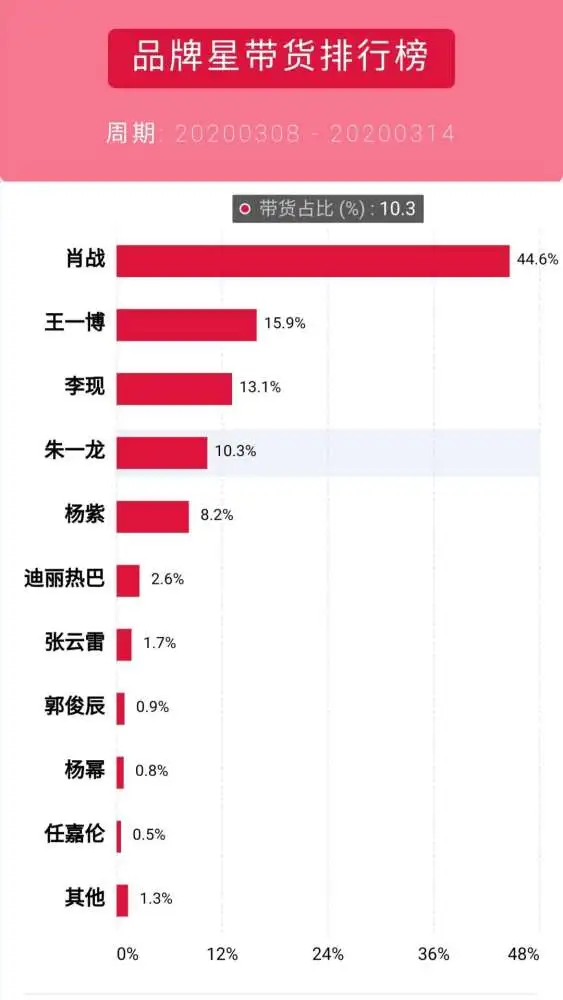 Trên bảng thống kê giá trị thương mại, Tiêu Chiến cũng dẫn đầu với tỷ lệ 44,6%, áp đảo những cái tên còn lại. Danh sách được dựa trên những chỉ số như: